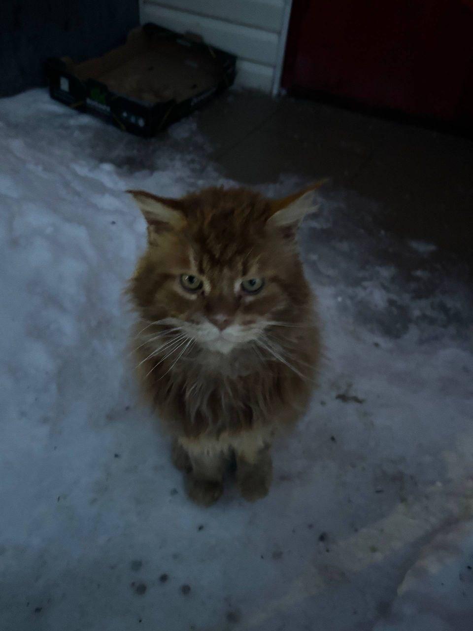 Пушистый огненно-рыжий мейн-кун уже несколько месяцев живёт на улице в городе Нефтекамск Республики Башкортостан. По словам работников кафе, к которому прибился кот, его подкармливают, но забрать домой никто не решается.