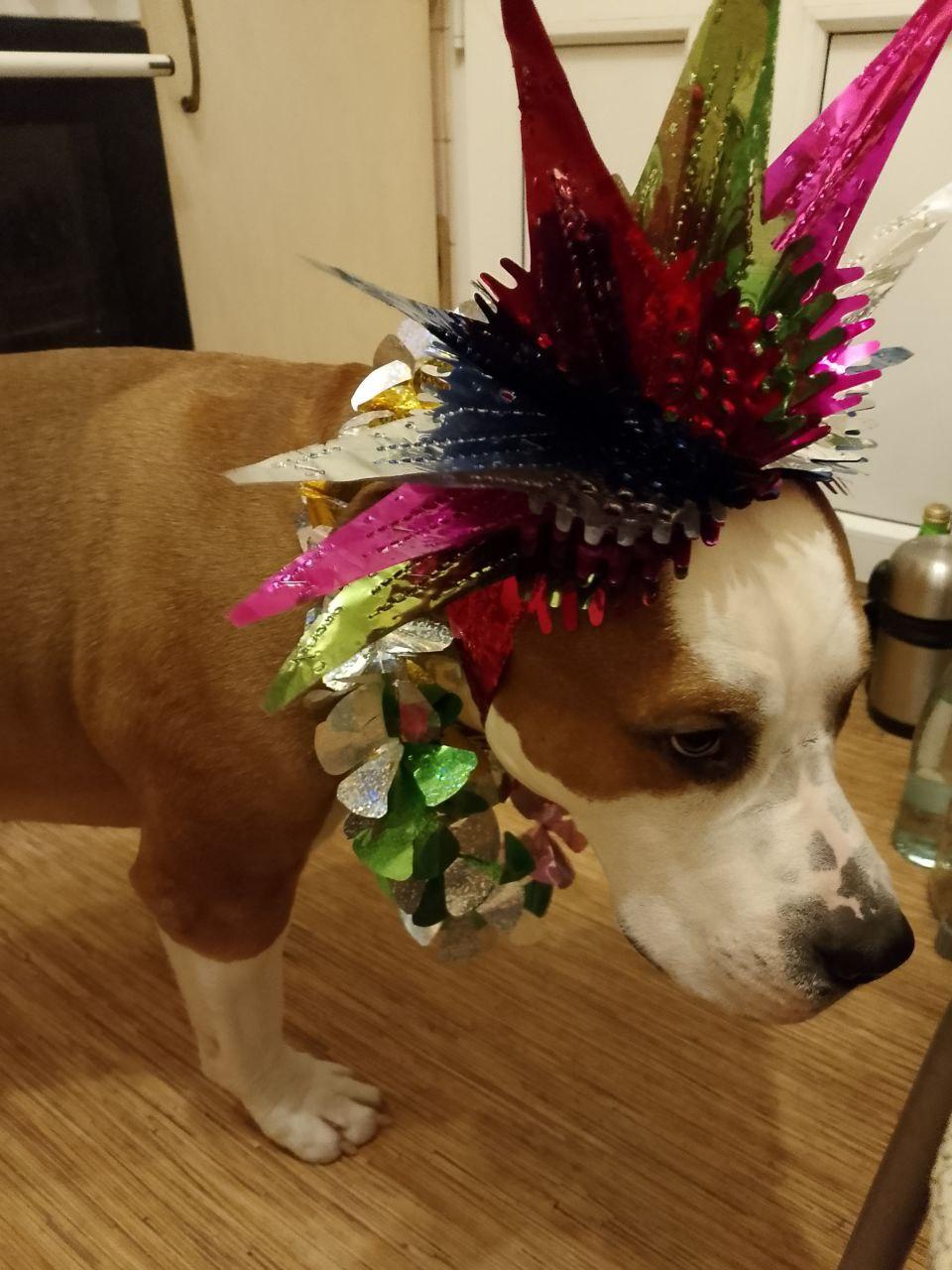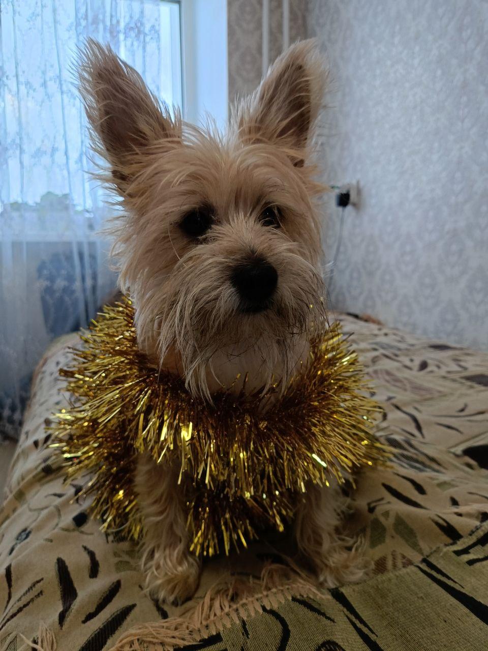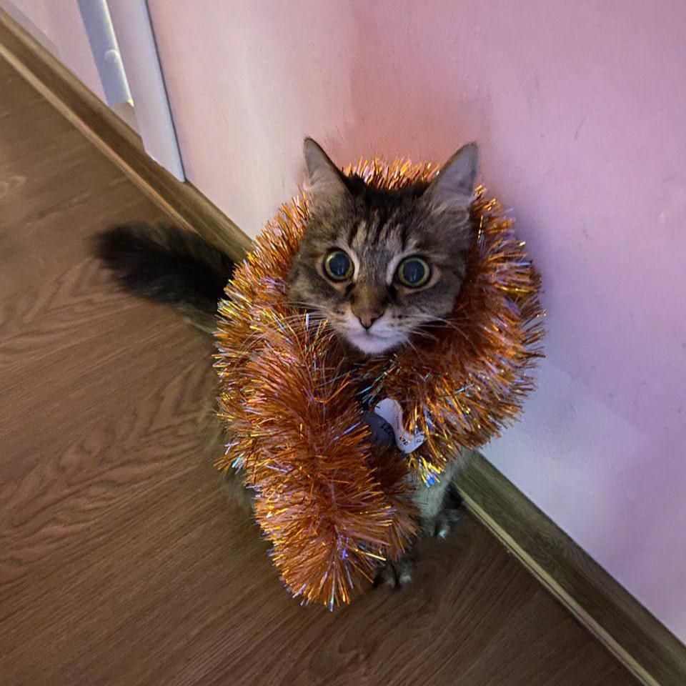 Питомец украшен безопасной мишурой
