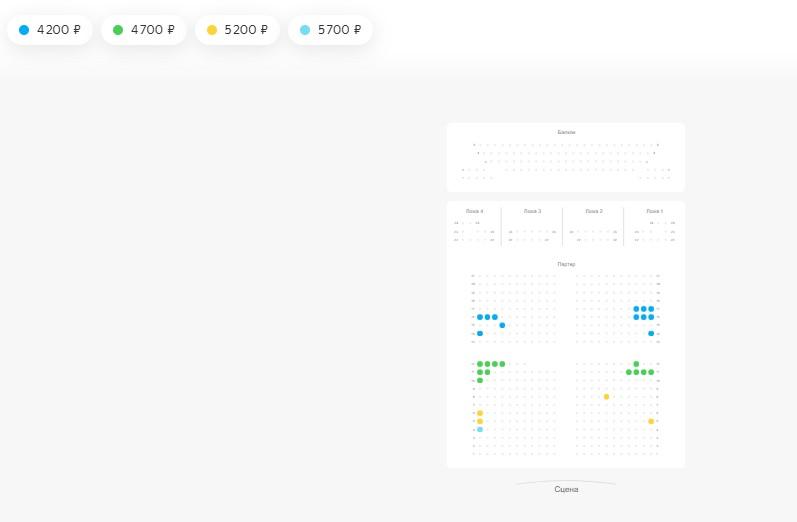 Билетов осталось очень мало — на схеме зала доступные места выделены цветом.