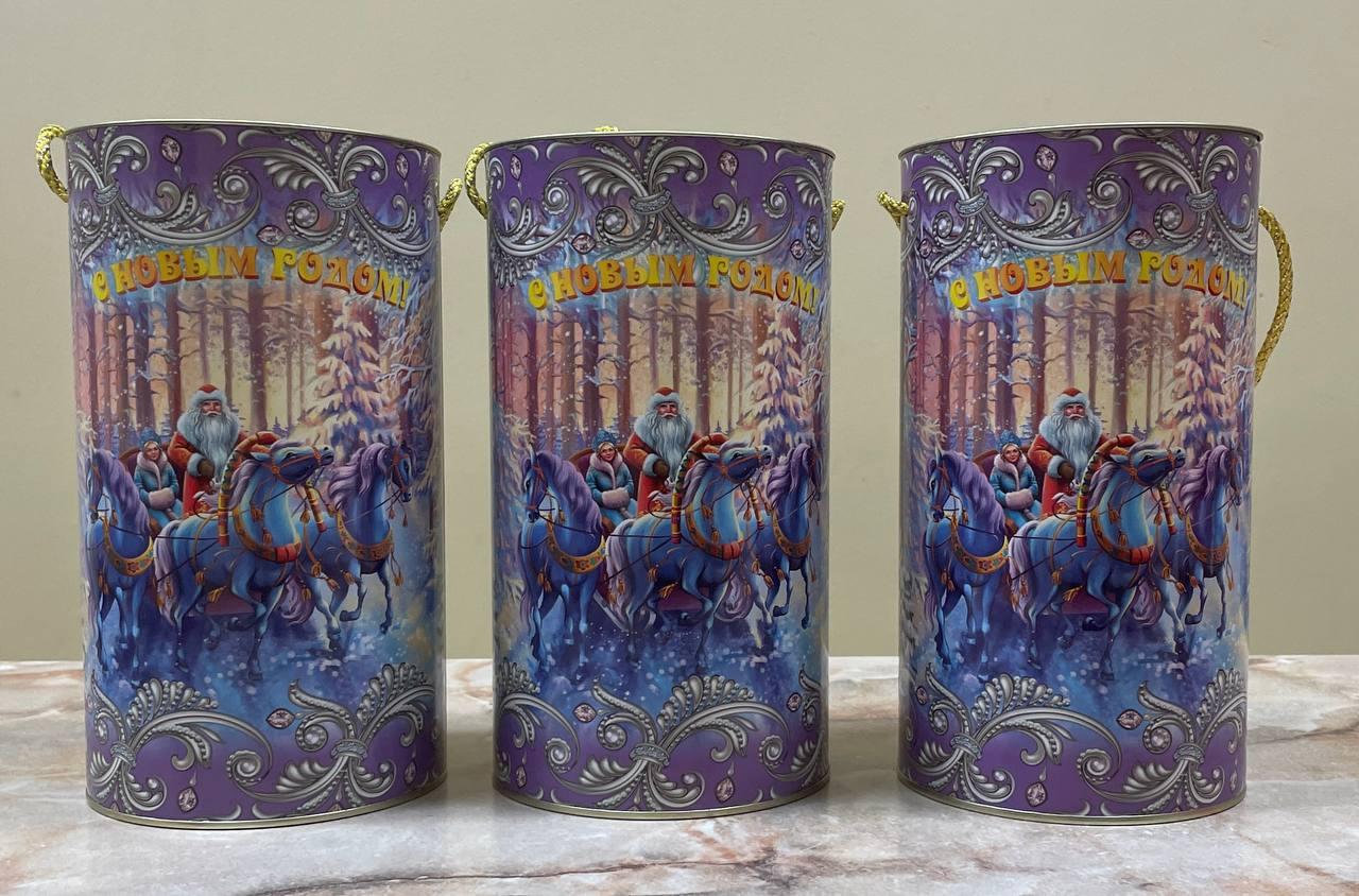 Подарок упакован в тубус, украшенный зимними узорами, надписью «С Новым годом!» и рисунком Деда Мороза со Снегурочкой в санях с тройкой белых лошадей. Внутри упаковки — 61 конфета, от шоколадных до мармеладных, по две-три штуки каждого вида.