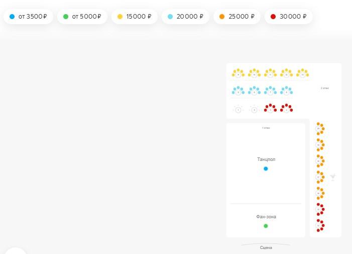 На схеме зала места за 30 тысяч рублей отмечены красным цветом; согласно данным, часть этих билетов уже приобретена.
