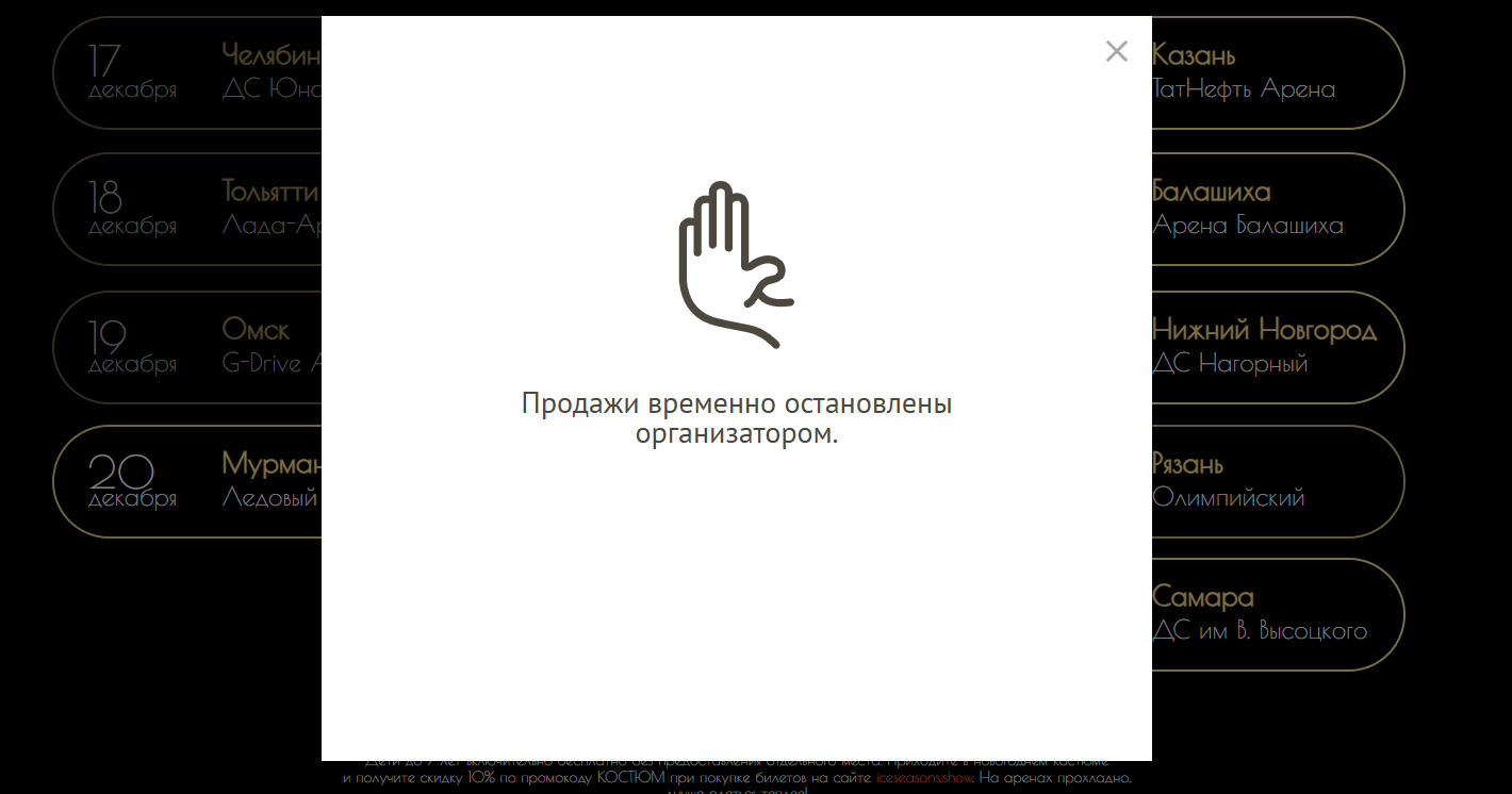 В «Городских зрелищных кассах» сообщили, что осведомлены об отмене шоу в Челябинске и Екатеринбурге, но организаторы не давали указаний прекращать продажи. На официальном сайте проекта Iceseasons.show продажа билетов приостановлена.