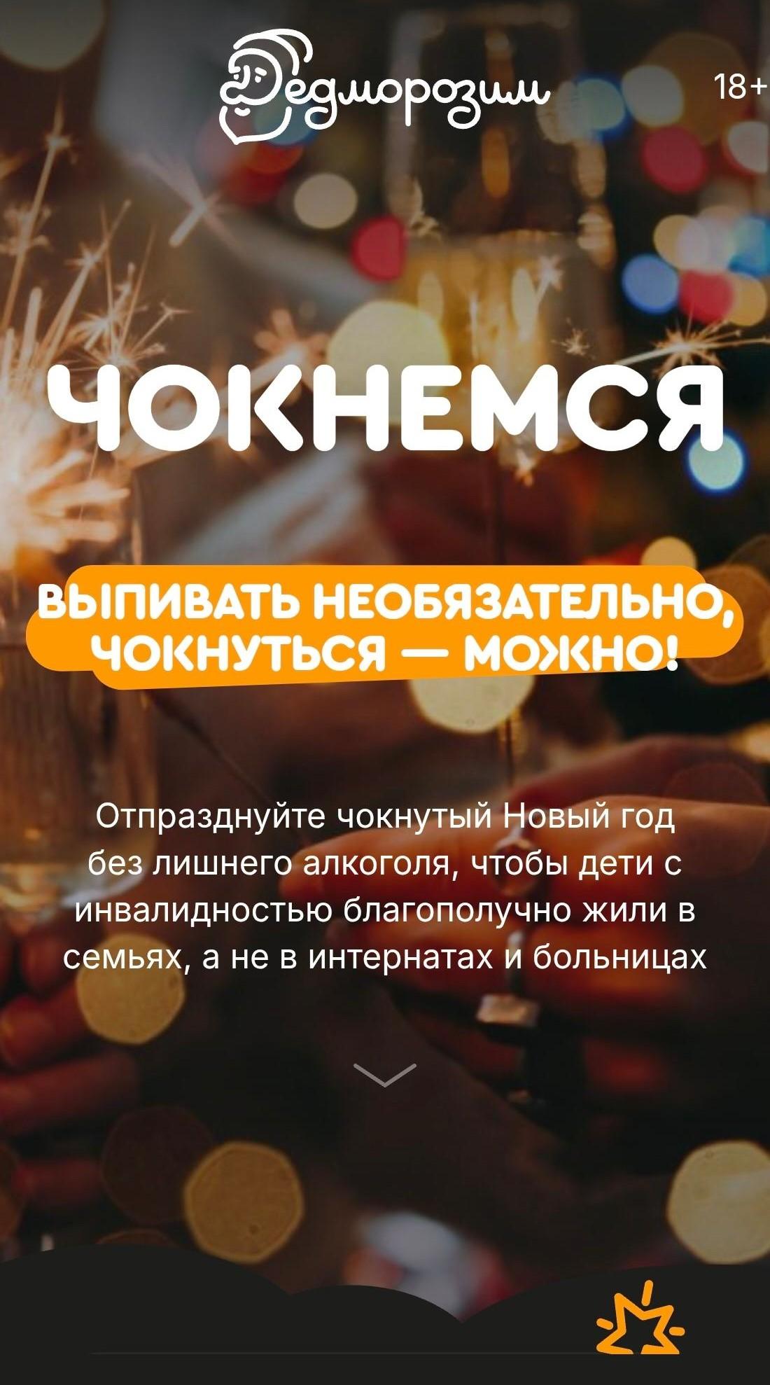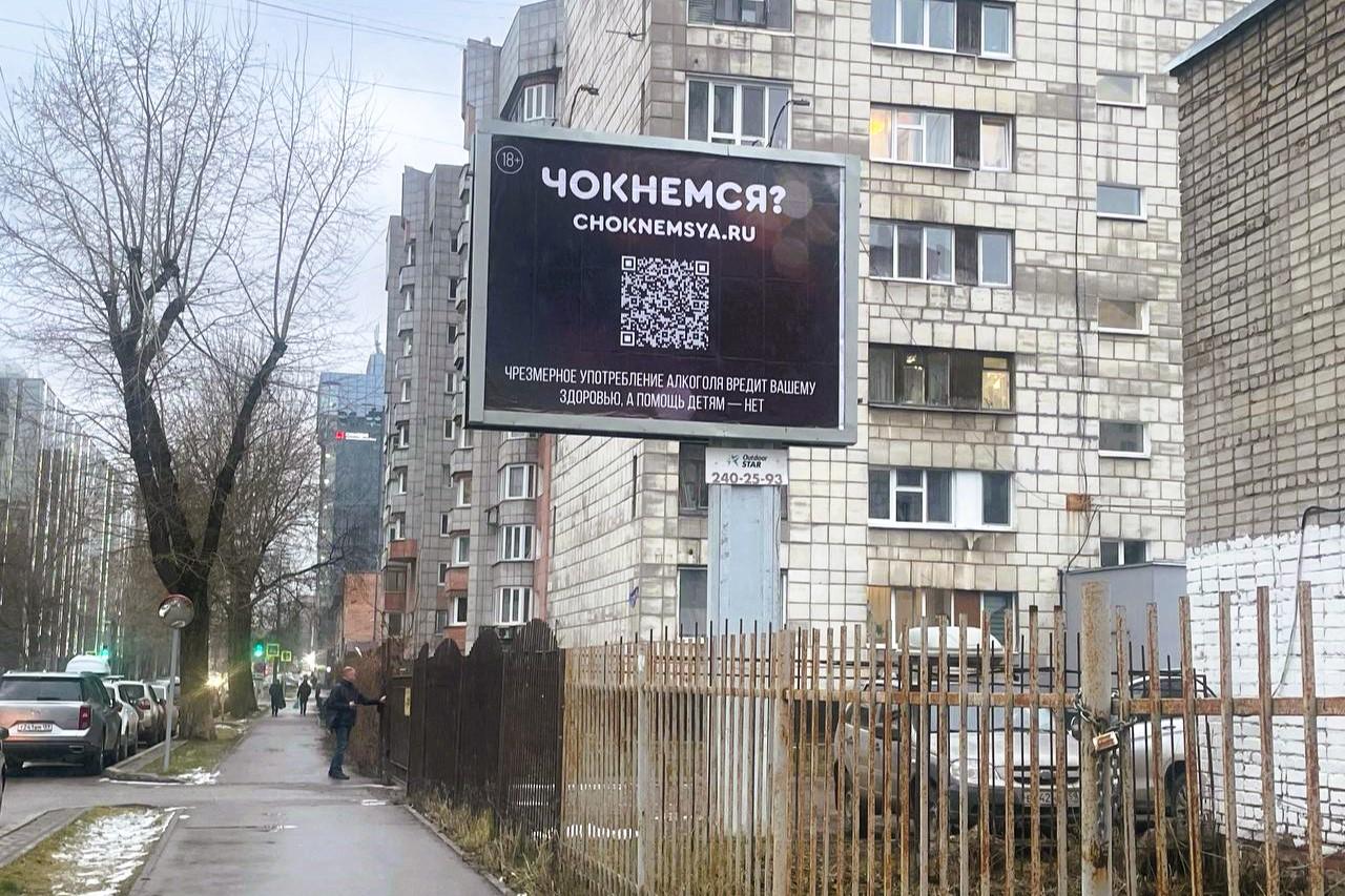 Акция под названием «Чокнемся» (18+) — это инициатива фонда «Дедморозим». Она призывает жителей города встретить Новый год без алкогольных напитков, а сэкономленные средства перевести на помощь тяжелобольным детям. При сканировании QR-кода пользователь попадает на сайт, где размещён призыв: «Отпразднуйте чокнутый Новый год без лишнего алкоголя, чтобы дети с инвалидностью благополучно жили в семьях, а не в интернатах и больницах».