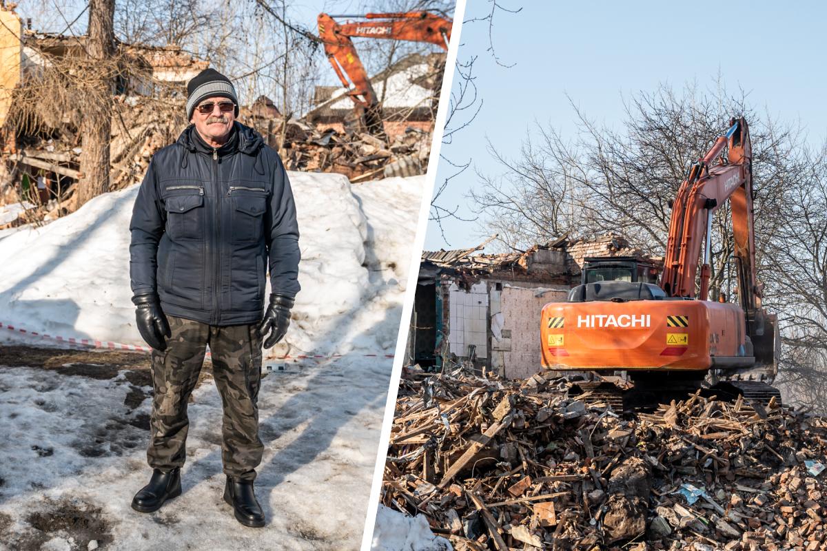 Мужчину выселили 11 марта из аварийного дома на улице Адмирала Старикова, 5. Сейчас он ночует на диване среди своих вещей и наблюдает за сносом здания.