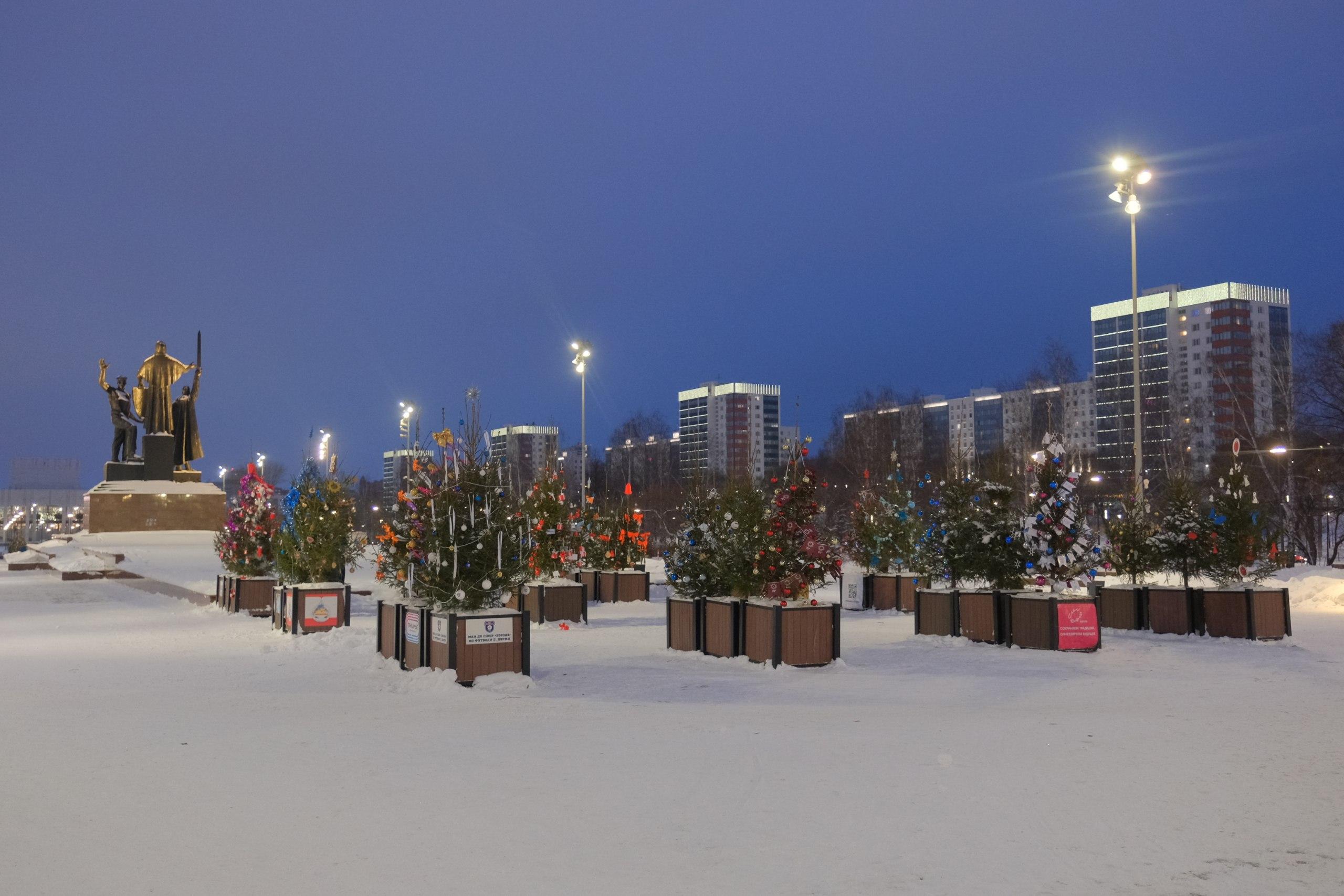 Сто украшенных елей появились у памятника в Перми