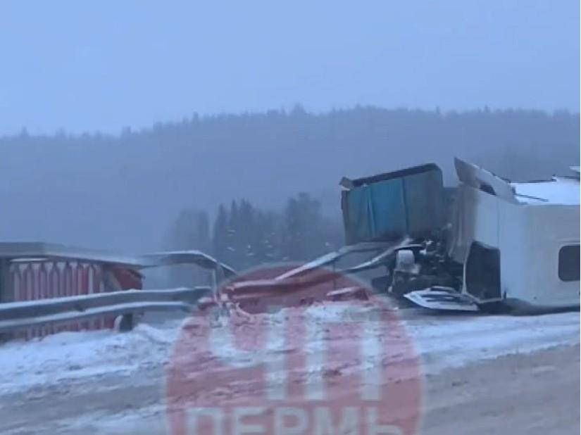 В интернете появилась видеозапись, на которой у края моста через реку Полазна запечатлен разбитый большегруз. Транспортное средство, протаранив ограждение, разделилось на две части: прицеп остался на месте, а кабина перевернулась. Сильно поврежденное ограждение указывает на то, что грузовик чуть не упал с высоты.