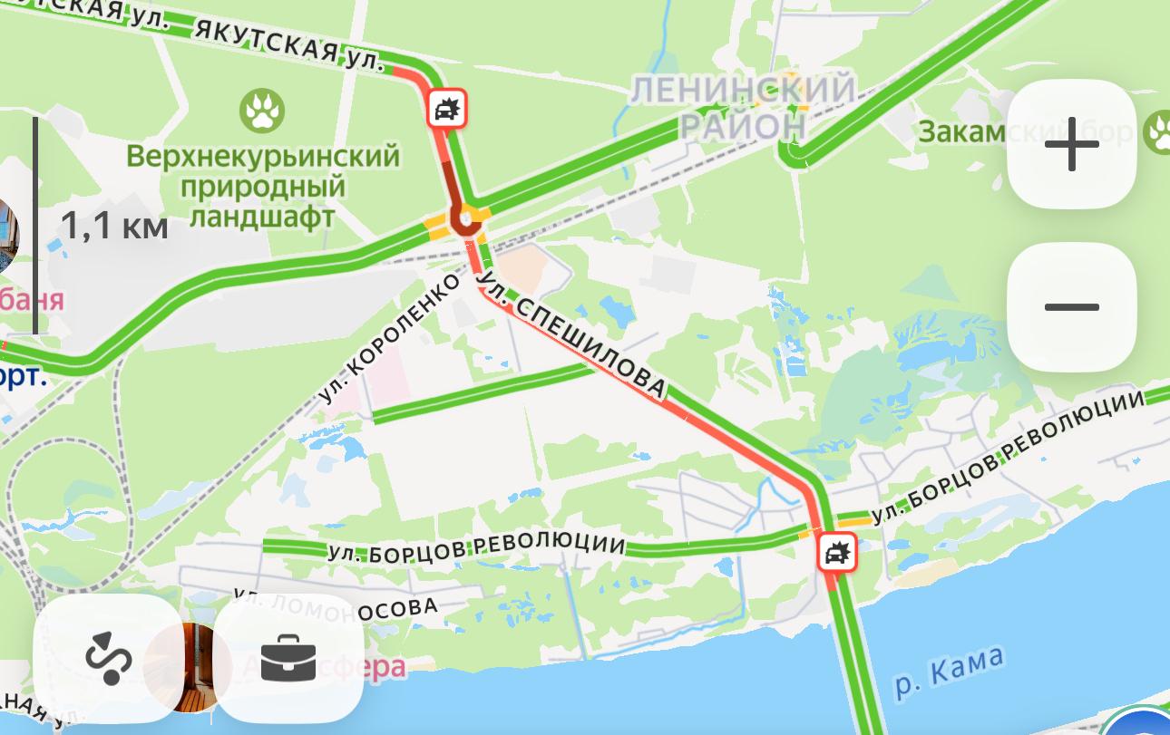 Данные с «Яндекс Карт» свидетельствуют о пробке длиной примерно 3,5 километра, которая тянется от Якутской улицы по Спешилова до Коммунального моста. Около 9:30 ситуация усугубилась из-за второго ДТП на Якутской, что привело к дальнейшему росту затора.