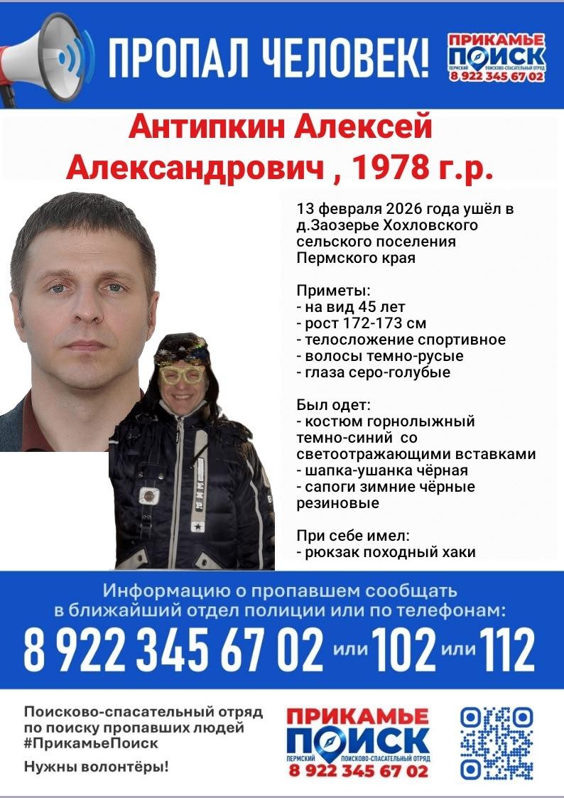 По данным поискового отряда «ПрикамьеПоиск», на пропавшем был темно-синий горнолыжный костюм со светоотражающими элементами, черная шапка-ушанка и черные резиновые сапоги. При себе у Алексея Антипкина был походный рюкзак.