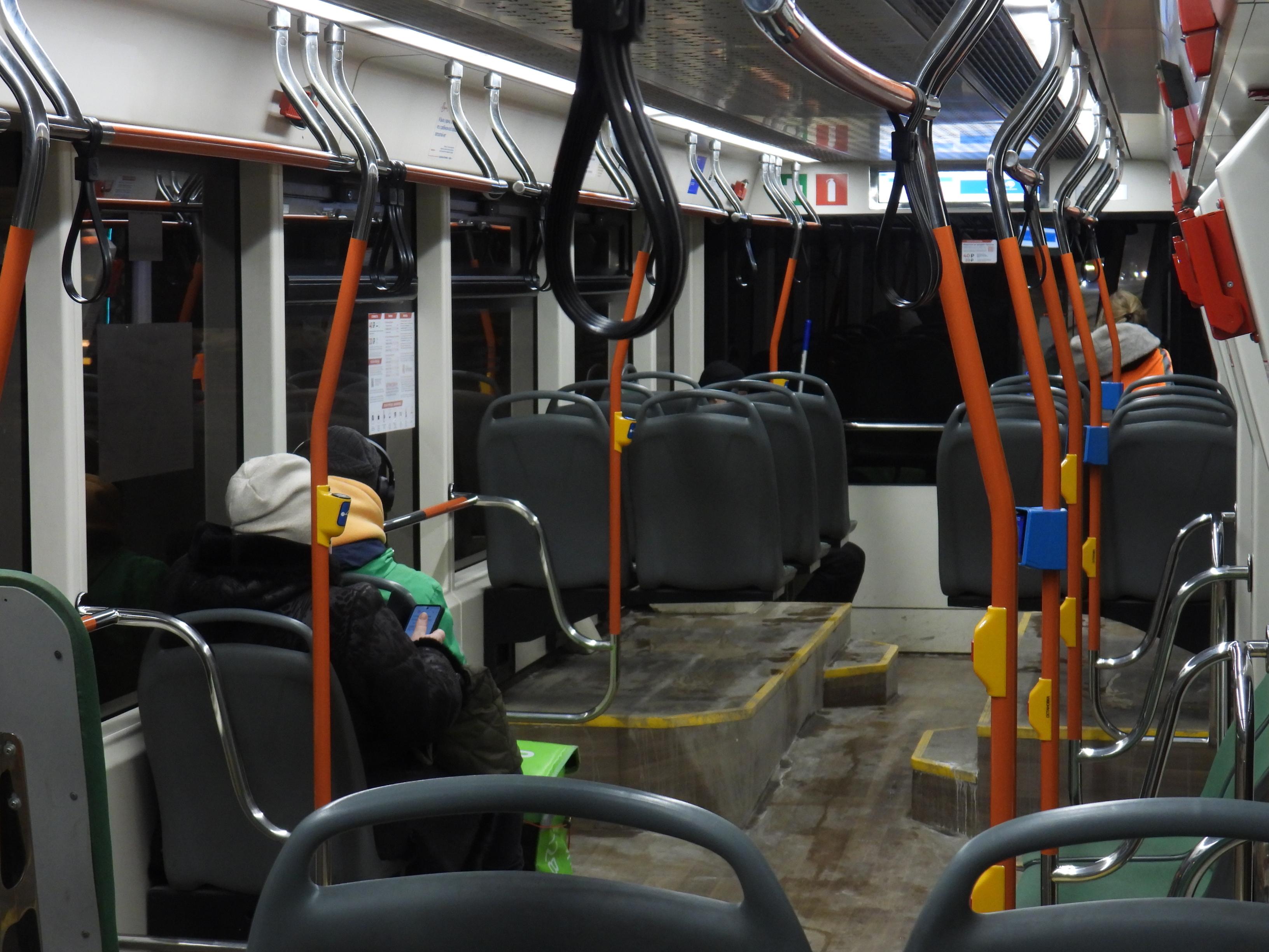 Первый трамвай вышел на линию с депо «Красный Октябрь» в 5:20 утра. На маршруте работают как современные модели «Львята», так и более старые вагоны. В ранний час пассажиров на остановках и в салонах было немного.