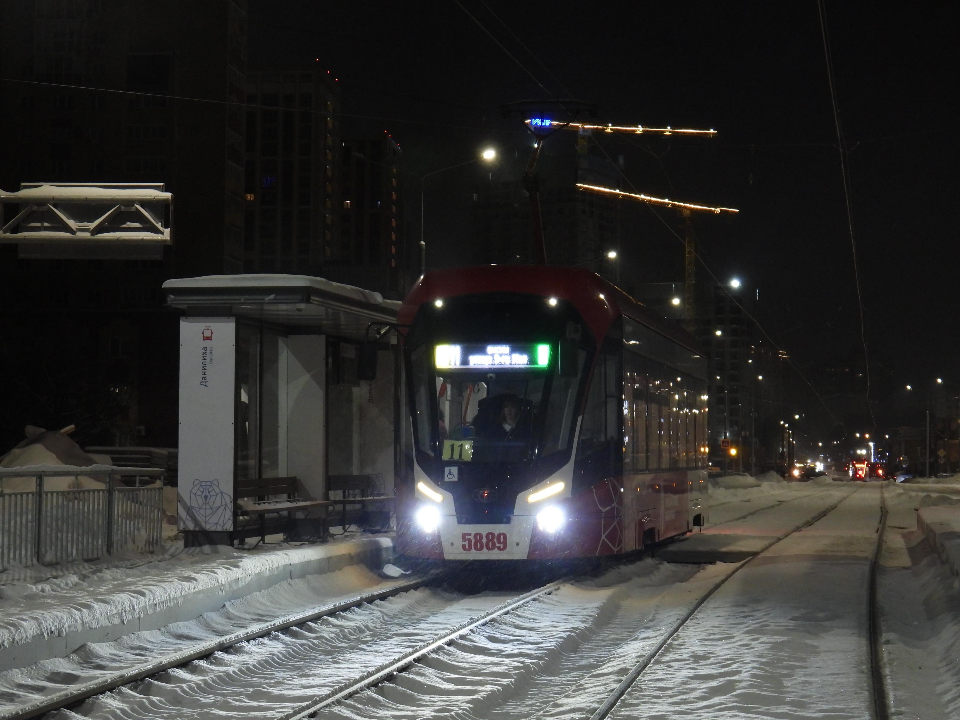 Первые трамваи вышли на линию на улице Карпинского затемно