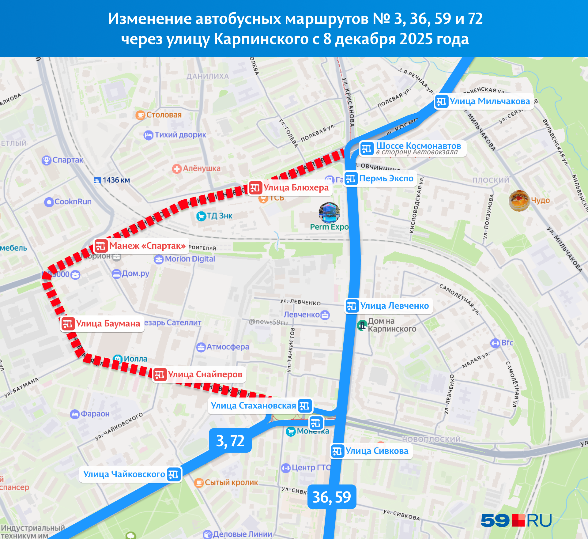 С понедельника, 8 декабря, автобусы маршрутов № 3, 36, 59 и 72 начнут следовать по обновлённому участку улицы Карпинского. На их пути появятся остановки «Улица Левченко» и «Пермь Экспо», а петля через манеж «Спартак» будет упразднена.