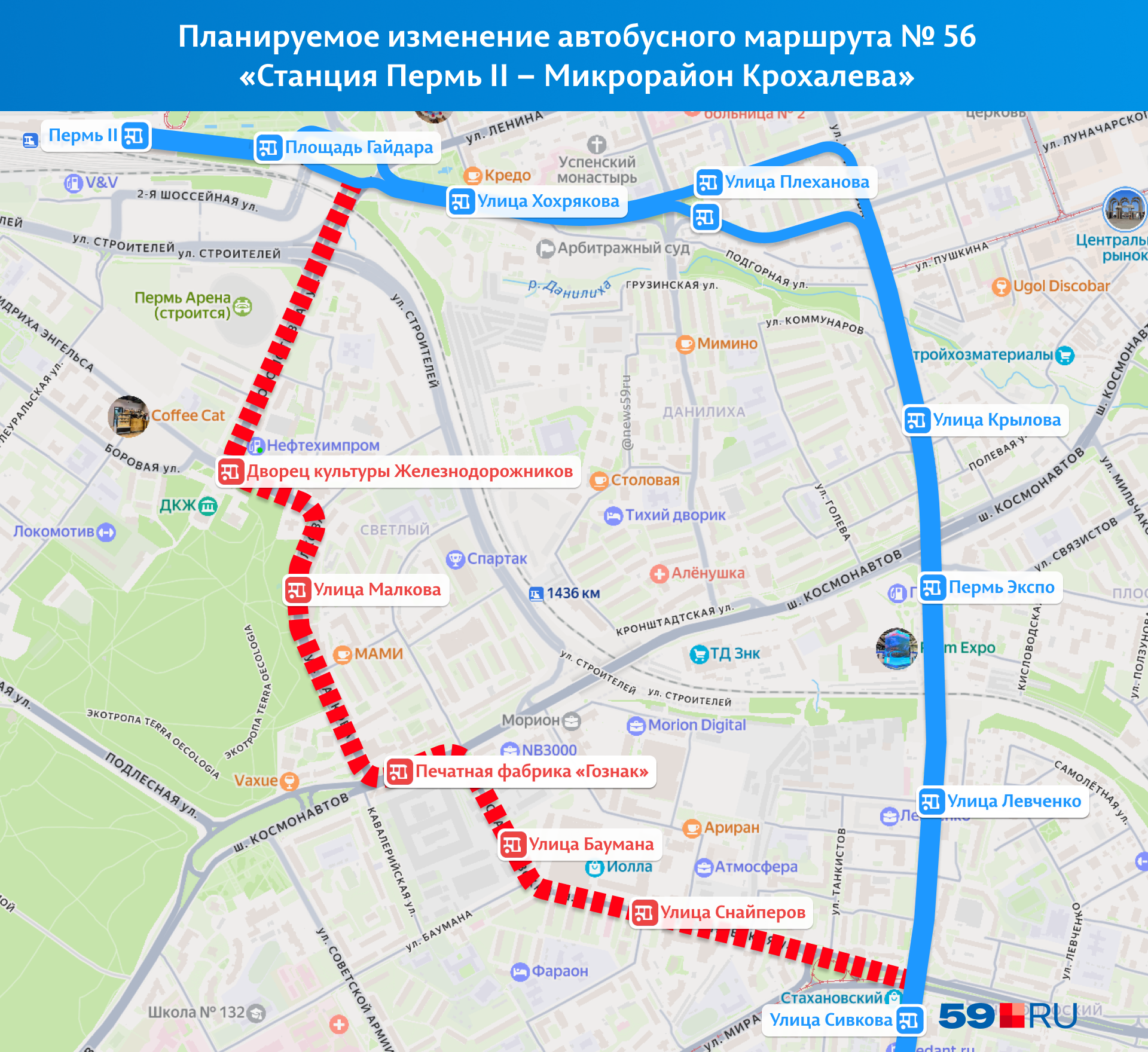 Кроме того, в декабре планируется изменить маршрут № 56 «Микрорайон Крохалева — Станция Пермь II». Эти автобусы также станут курсировать по улице Карпинского до Екатерининской. Точная дата изменения 56-го маршрута пока не уточняется.