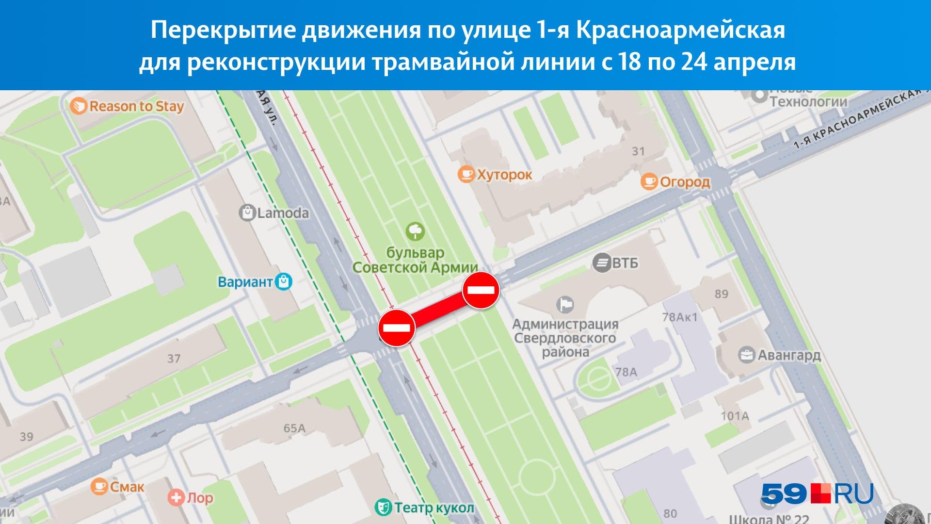 В Перми с 18 апреля полностью перекрыто движение на перекрестке улиц Сибирской и 1-й Красноармейской. Причиной стала реконструкция трамвайных путей, которая продлится до пятницы, 24 апреля.
