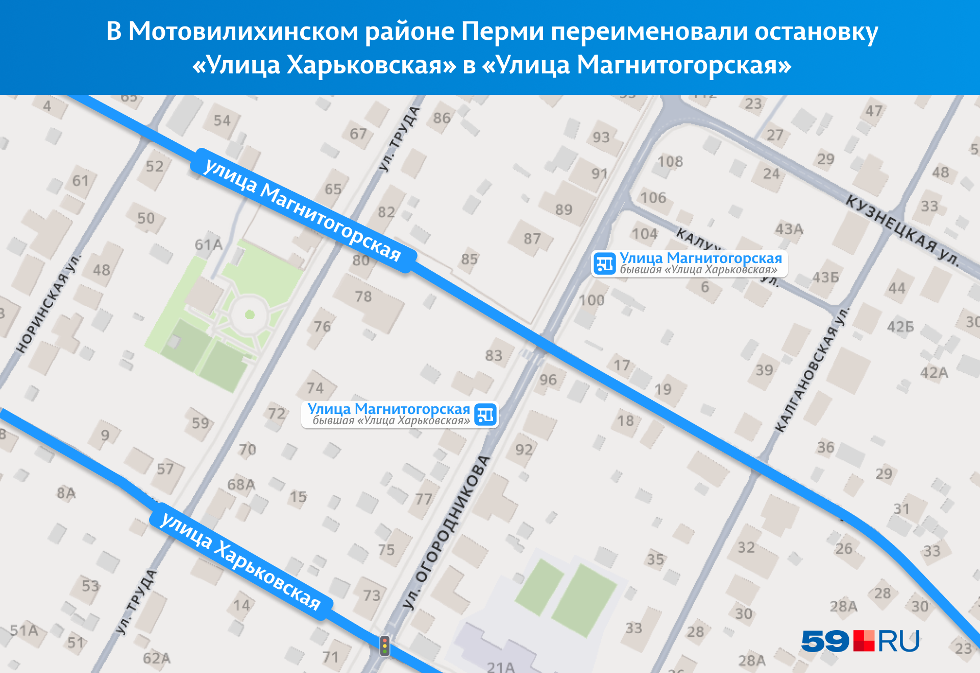 Остановка общественного транспорта «Улица Харьковская» в Мотовилихинском районе Перми теперь носит название «Улица Магнитогорская». Соответствующее постановление подписал мэр Эдуард Соснин.