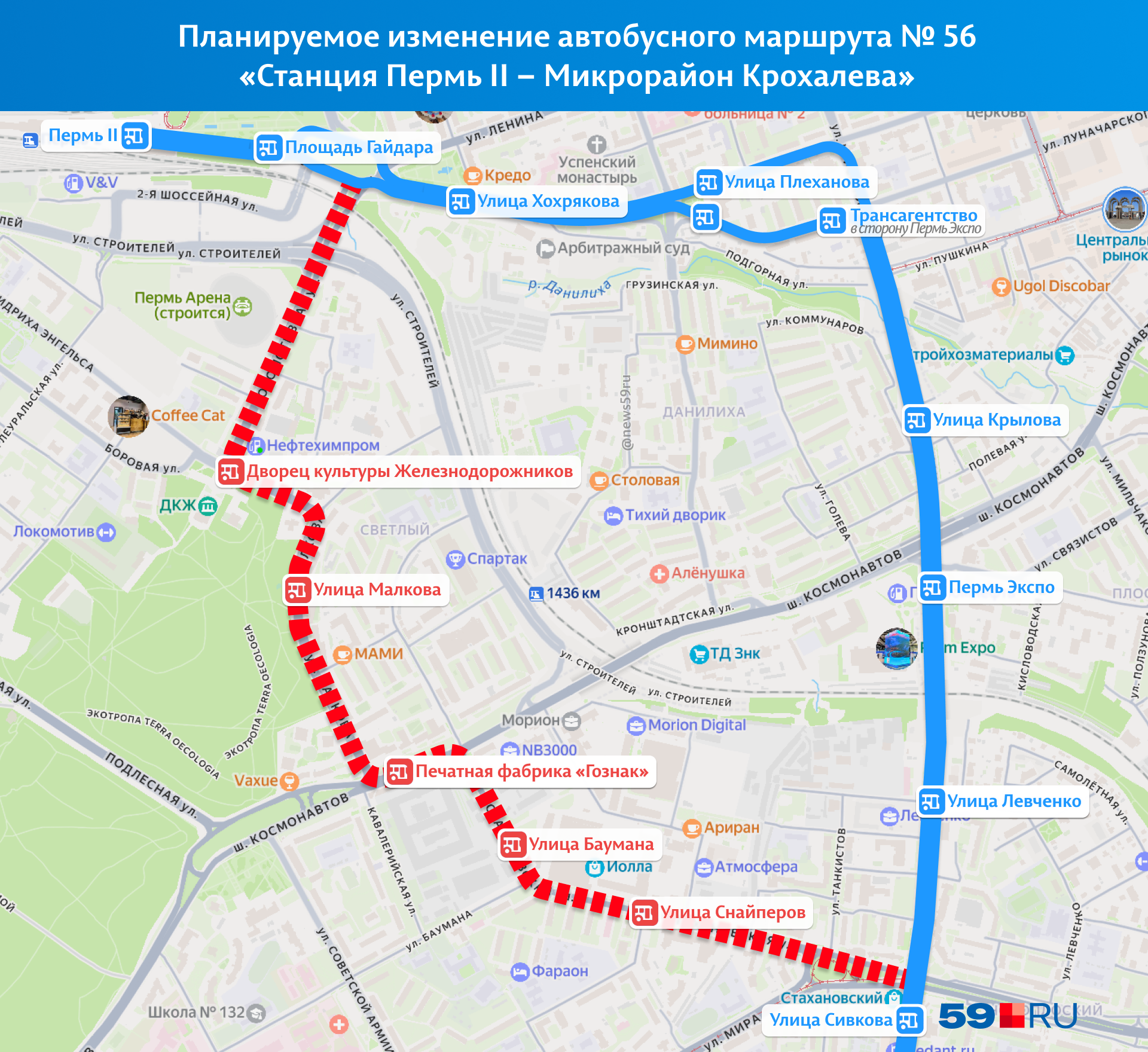 В декабре планируется изменить маршрут №56 «Микрорайон Крохалева — Станция Пермь II», однако точная дата пока не названа. Ранее этот автобус следовал по улице Карпинского и шоссе Космонавтов, но из-за предстоящей реконструкции путепровода его направят через улицы Крисанова и Екатерининскую.