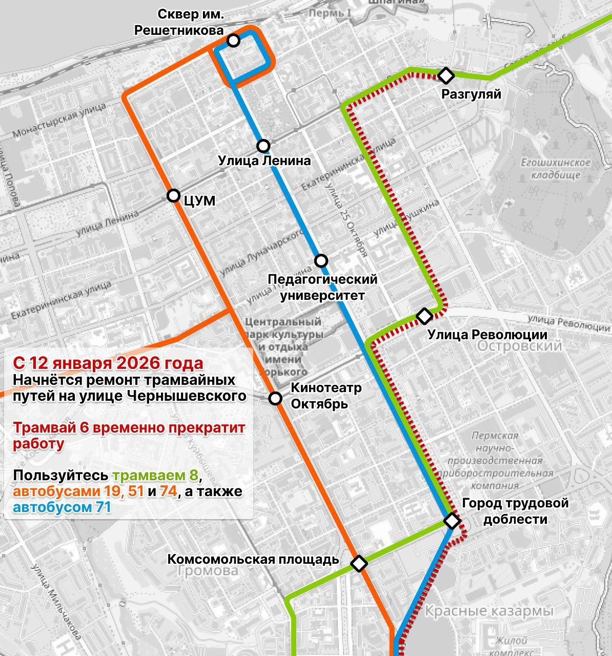 Работы стартуют 12 января, и с этого дня трамваи №6 перестанут курсировать. Пассажирам рекомендуется использовать альтернативные маршруты: